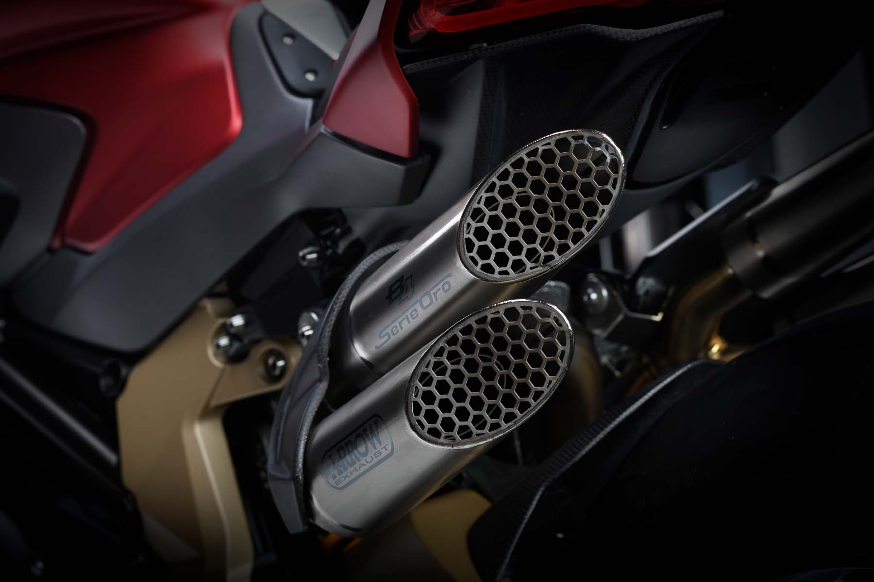 The 4-cylinder engine of the Brutale 1000 Serie Oro reaches a record-breaking 208 hp at 13,450 rpm. When matched with an Arrow exhaust system and dedicated ECU, this figure rises even further, reaching a breath-taking 212 hp (156 kW) at 13,600 rpm. The fastest naked bike on the planet smashes all barriers, claiming a top speed of over 300 km/h.